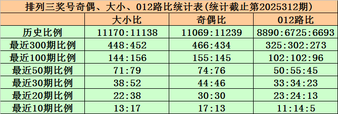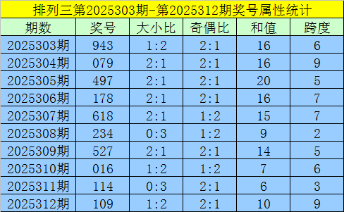上期回顾:排列三第2025312期出现奖号109。开出组六,奇偶比2:1,012路比2:1:0,大小比1:2,和值10,跨度9。